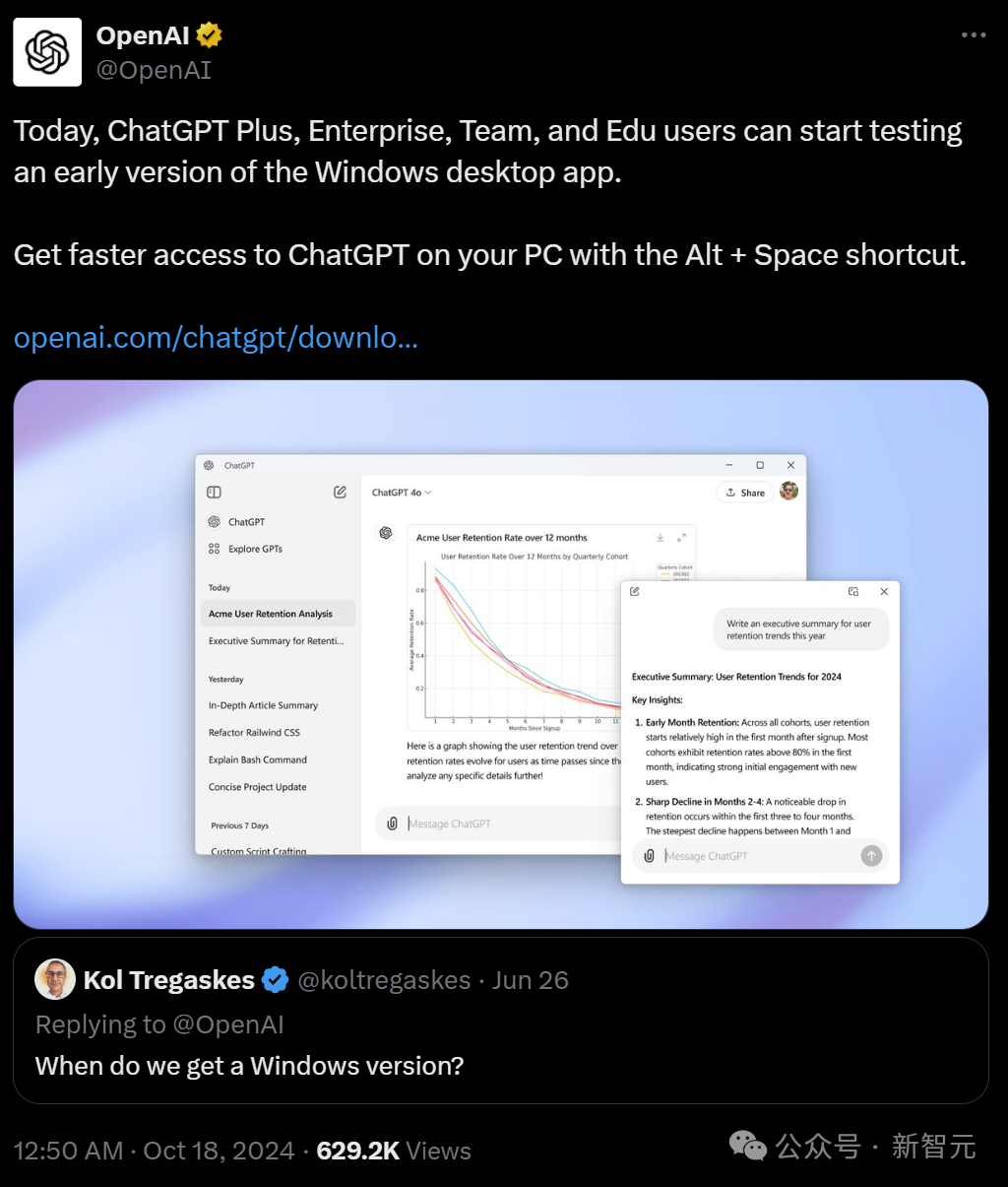 【新智元导读】终于,Windows用户也可以用上ChatGPT了。就在刚刚,OpenAI推出了适用Windows系统的ChatGPT应用。不过,目前仅供ChatGPT Plus、Team、Enterprise和Edu用户使用。