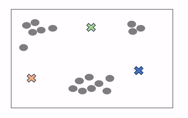 - 每个数据点测量自己到每个质心的距离(通常使用欧几里得距离),并将自己分配给最近的质心。