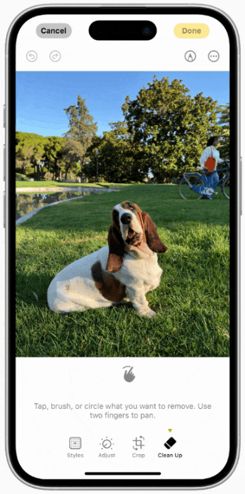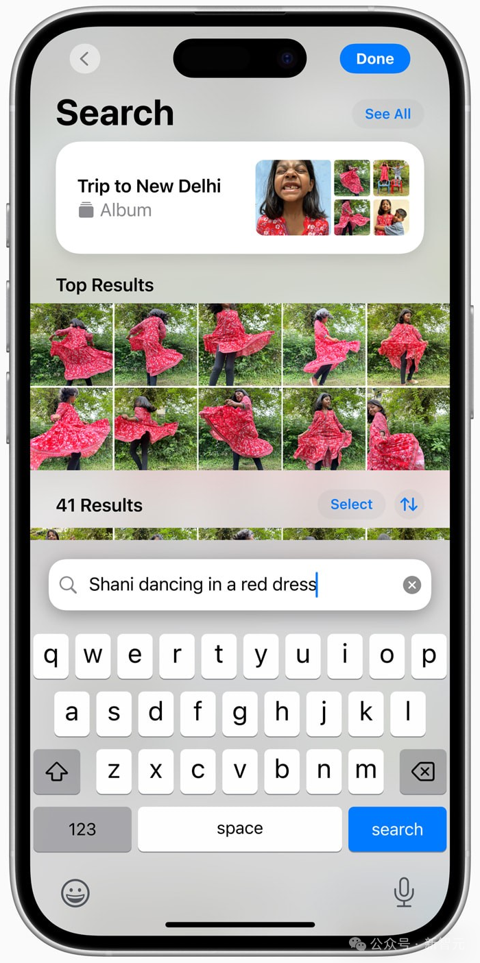 一句话查找照片新能力,终于也在iPhone、Mac中上线了。在成千上万的照片库中寻找想要的那张,简直如大海捞针一般。如今,有了苹果AI,不管想找什么图,我们只要用自然语言描述,就能轻松找到想查找的内容了。比如,穿着衣服的Bandit,只需几秒钟时间就找到了。你还可以轻松制定温馨的回忆影片,只需输入一段描述,比如「全家去华盛顿旅行,配上轻快的音乐」。在iPhone中,比如说一句「Maya穿着扎染T恤玩滑板」,就能立刻找到相册中对应的照片。同样的功能也适用于视频,通过自然语言搜索,就可以找到对应特定片段发生事情的视频。另外,搜索还能提供智能完成建议,帮用户快速完成搜索。并且,当照片中出现我们不想要的人或物体时,可以用清理工具来删除这些分散注意力的元素。而在「回忆」功能中,我们只需输入一些描述,就可以创建自己想看的电影了。