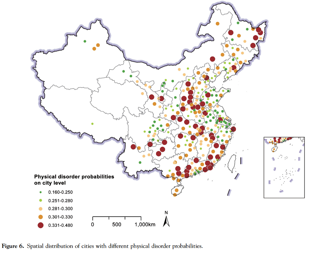 城市空间中的物理失序或邻里物理失序是指由可观察或可感知的视觉信号引起的对居民生活和公共空间的干扰(Skogan,1990)。有证据表明,物理失序