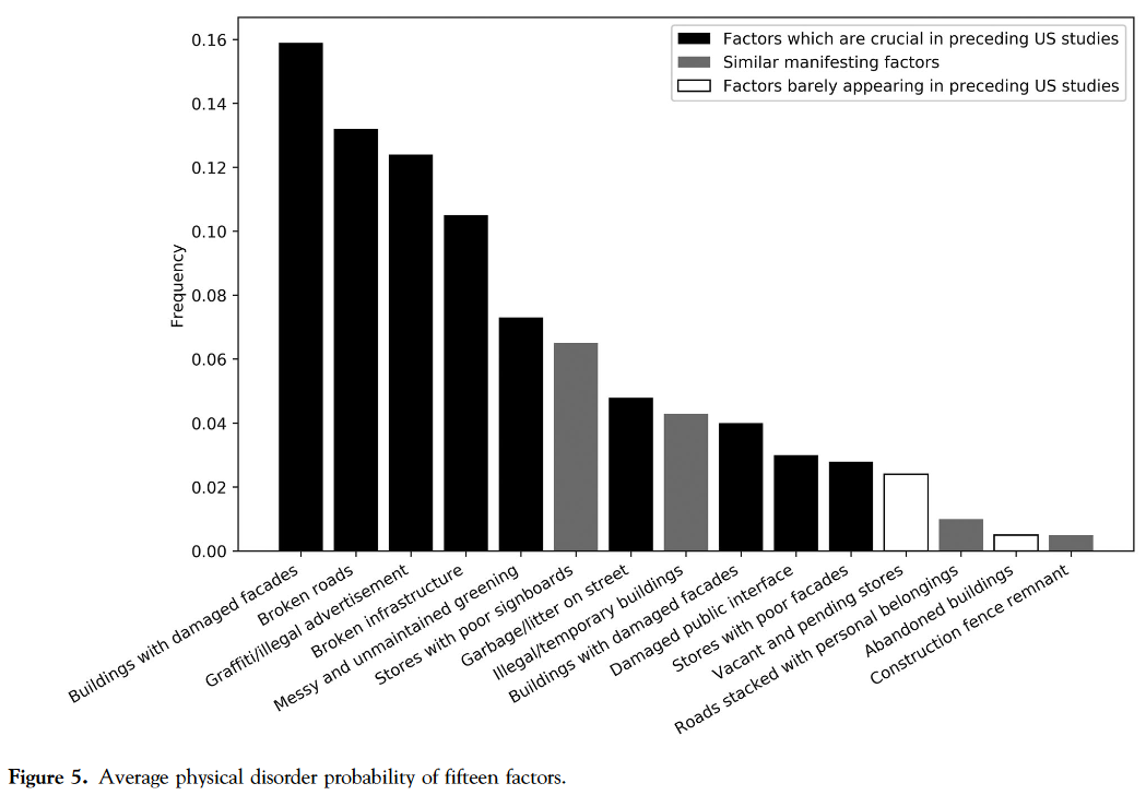 物理失序被认为是街道上存在特定视觉物品,并对个人对空间舒适度和安全性的看法产生负面影响(Franzini 等,2008)。例如,在芝加哥社区人类发展项目中,大约 90% 的受访者认为街道或人行道上的垃圾或碎玻璃表明秩序混乱(Sampson 和 Raudenbush,1999)。在一项调查中,建筑物上窗栏的存在使得近一半的人更有可能判断该空间是无序的(Day et al. 2006)。因此,为了充分了解物理失序的影响及其机制,有必要对这些与障碍相关的视觉项目进行大规模、全面的测量。