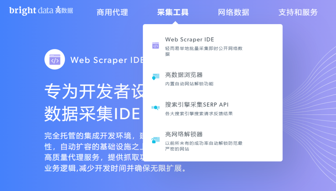亮数据爬虫 亮数据平台提供了强大的数据采集工具,比如Web Scraper IDE、亮数据浏览器、SERP API等,能够自动化地从网站上抓取所需数据,无需分析目标平台的接口,直接使用亮数据提供的方案即可安全稳定地获取数据。