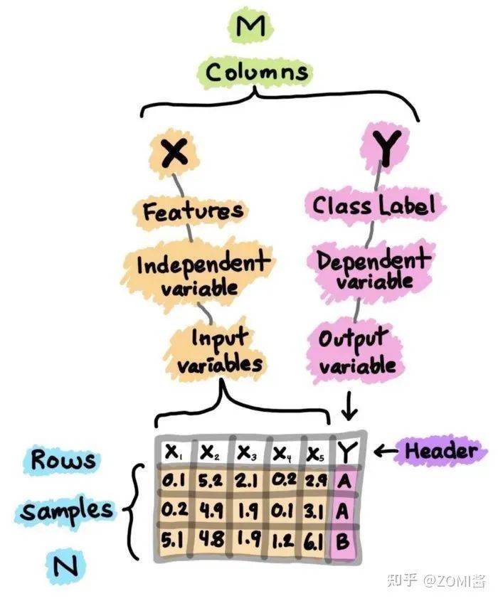 列可以分解为X和Y,X是可以指特征、独立变量或者是输入变量。Y也是可以指类别标签、因变量和输出变量。
