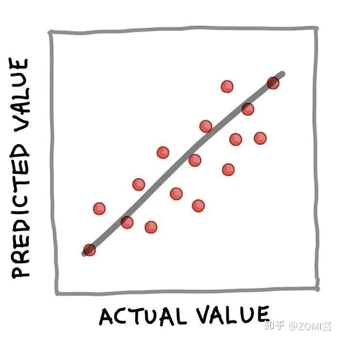 上面的回归例子公式的实质是,如果X已知,就可以推导出Y。一旦Y被计算(预测)出来,一个流行的可视化方式是将实际值与预测值做一个简单的散点图,如下图所示。