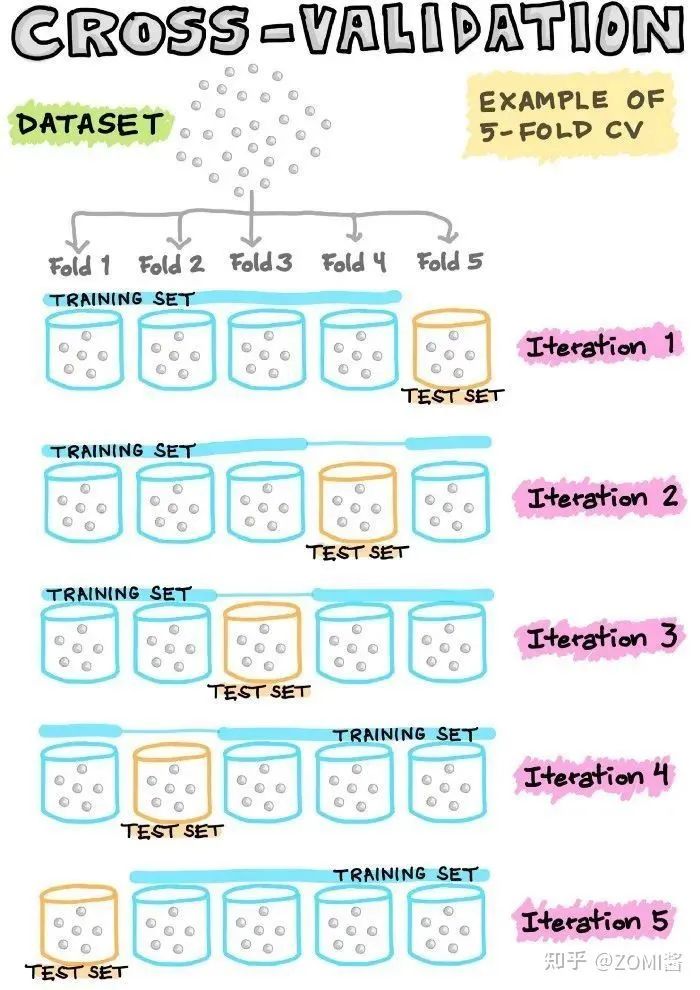 实际上数据是机器学习流程中最宝贵的,为了更加经济地利用现有数据,通常使用N倍交叉验证,将数据集分割成N个。在这样的N倍数据集中,其中一个被留作测试数据,而其余的则被用作建立模型的训练数据。通过反复交叉迭代的方式来对机器学习流程进行验证。