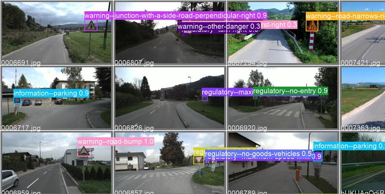 通过记录超过 350 公里的瑞典高速公路和城市道路的序列,创建了一个数据集。一个 1.3 兆像素的彩色摄像机,一个点灰色变色龙,被放置在一辆汽车的仪表板上,从前窗向外看。摄像头略微指向右侧,以便尽可能多地覆盖相关标志。该镜头的焦距为 6.5 毫米,视野约为 41 度。高速公路上的典型速度标志大约为 90 cm 宽,如果要在大约 30 m 的距离处检测到它们,则对应于大约 50 像素的大小。总共记录了超过 20 000 帧,其中每五帧被手动标记。每个标志的标签包含标志类型(人行横道、指定车道右侧、禁止站立或停车、优先道路、让路、50 公里/小时或 30 公里/小时)、能见度状态(遮挡、模糊或可见)和道路状态(是否标志是在正在行驶的道路上或在小路上)。