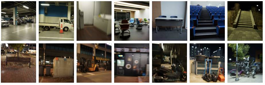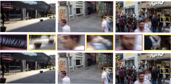 用于去模糊的 GoPro 数据集由 3,214 张模糊图像组成,大小为 1,280×720,分为 2,103 张训练图像和 1,111 张测试图像。该数据集由成对的真实模糊图像和高速摄像机获得的相应地面实况图像组成。