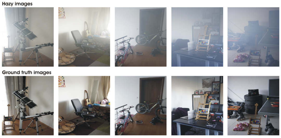 该数据集中包含 35 个有雾图像对和相应的无雾(地面实况)室内图像。与大多数现有的去雾数据库不同,雾霾图像是使用专业雾霾机产生的真实雾霾生成的。为了简化颜色校准并改进去雾算法的评估,每个场景都包含一个 MacBeth 颜色检查器。此外,由于图像是在受控环境中捕获的,因此无雾和有雾图像都是在相同的照明条件下捕获的。
