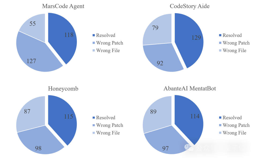 团队对目前SWE-bench Lite排行榜上排名前三的工具(CodeStory Aide,Honeycomb和AbanteAI MentaBot)进行了错误定位能力评估。对于一个patch,如果它修改的文件和gold patch所修改的文件相同,则认为错误定位正确,否则错误。分析结果如图6所示: