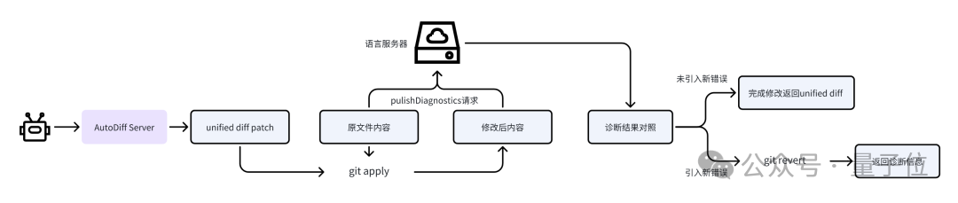 尽管AutoDiff能够正确完成大部分的代码编辑请求,但仍然会存在诸如类型错误、变量未定义、缩进调整错误、括号没有正确闭合等LLM常见的代码编辑语法问题,针对这些问题,团队使用语言服务器协议对AutoDiff修改前后的文件进行静态代码诊断,过程如下: