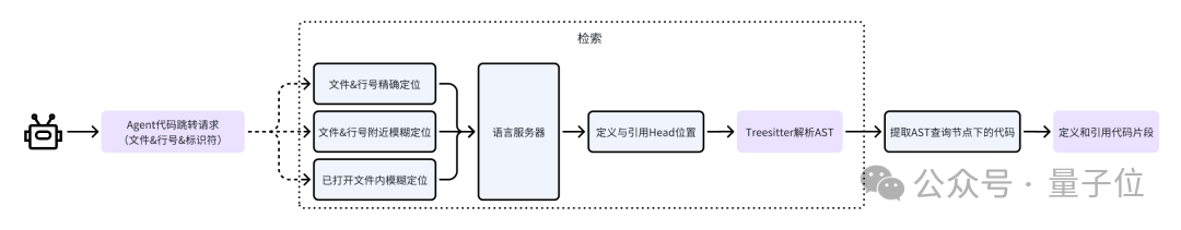 Agent调用语言服务器进行代码召回的过程与开发者在IDE中使用“Ctrl+左键”点击某个标识符进行代码跳转的过程是一致的,但由于Agent的数字定位和计算能力较弱,团队增加了模糊定位功能以进一步强化Agent使用LSP工具的能力: