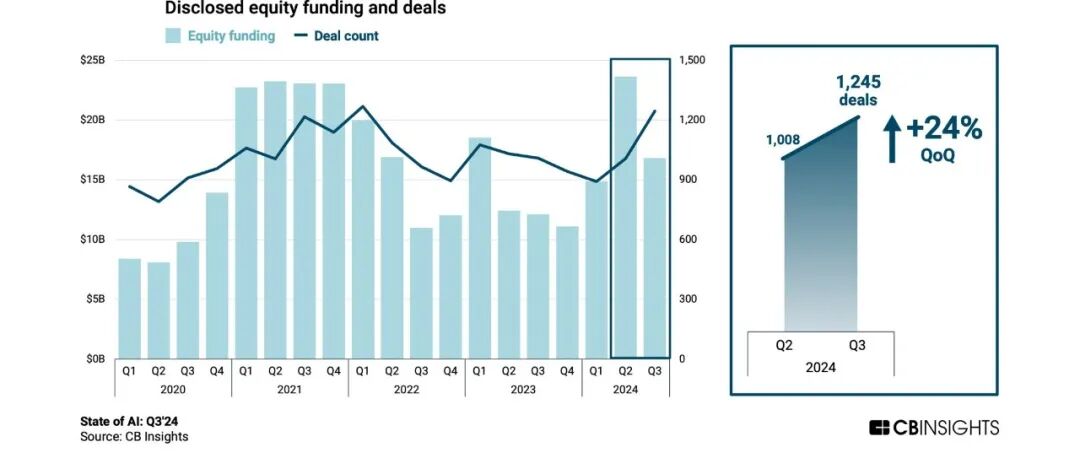 2024年第三季度全球AI交易量达到1245笔,创两年来新高,显示出投资者对AI领域的信心。尽管全球AI资金环比下降29%,但AI交易量同比增长24%,远超整体投资市场的负增长。美国AI初创公司吸引资金最多,占全球AI资金的三分之二以上。生成性AI和行业特定AI成为投资热点,推动了新的AI独角兽公司的诞生。