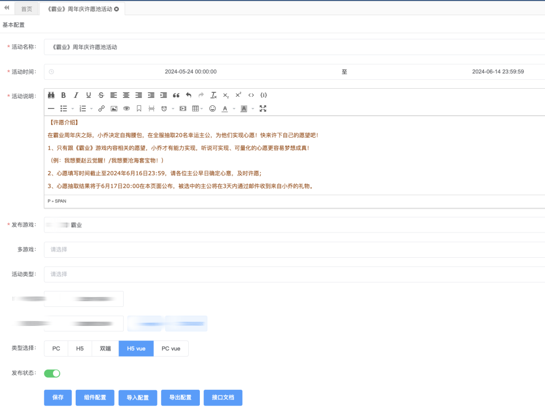 包括活动名称、类型、时间、规则、发布游戏等基本信息。