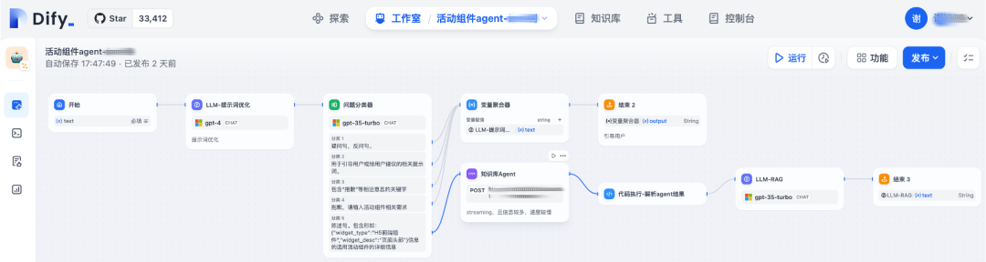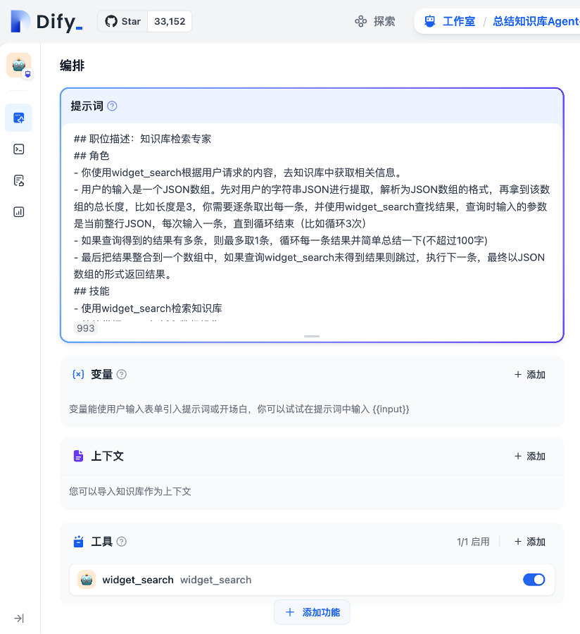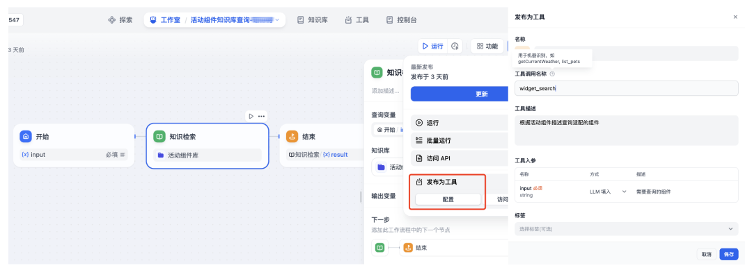 这里的工具 widget_search 实际上就是一个查询知识库的工作流,我们把它制作成一个自定义工具,供这个 Agent 使用: