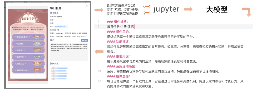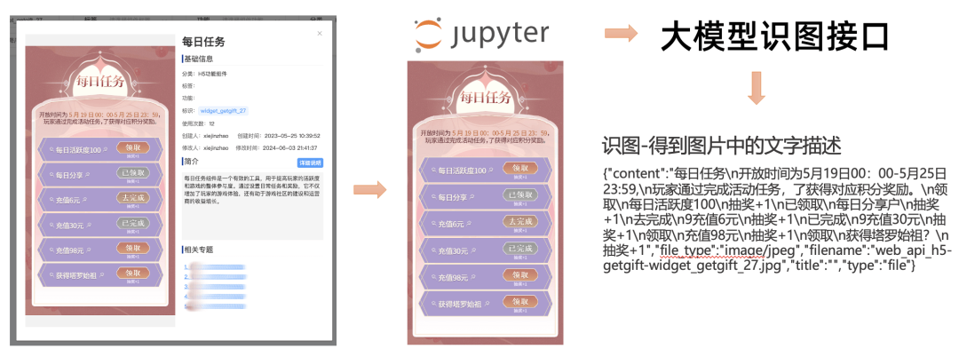 第一步,因为我们的原数据信息较少,这里采用大模型的识图接口,把组件库中每个组件的封面图内容识别出来,丰富组件的信息: