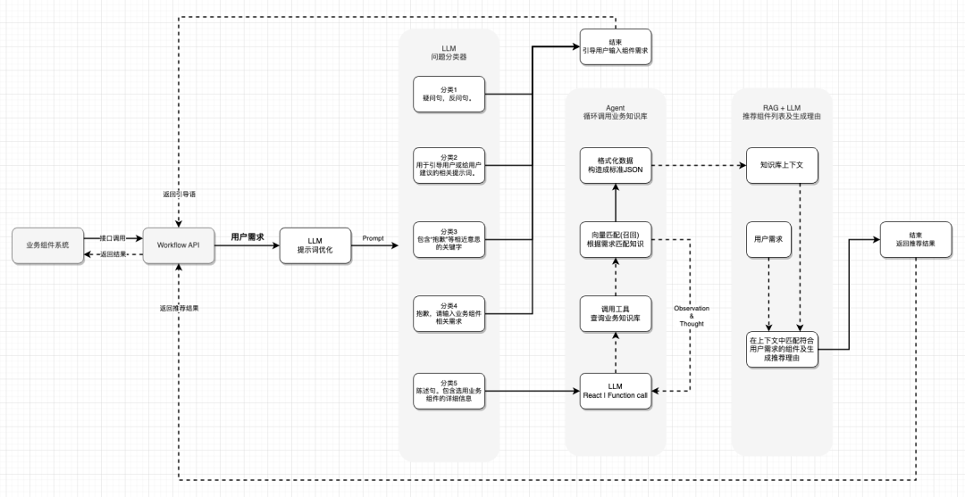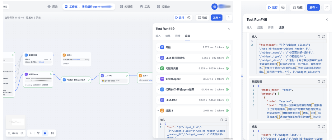 实现了活动专员输入 prompt → 大模型优化 prompt,贴合知识库的形式 → 再交给 Agent 去循环匹配知识库,找到最贴合的组件列表 → 最终再过一遍大模型,根据活动专员的需求和上下文中的业务知识库内容,为我们推荐出合适的组件列表及推荐理由。