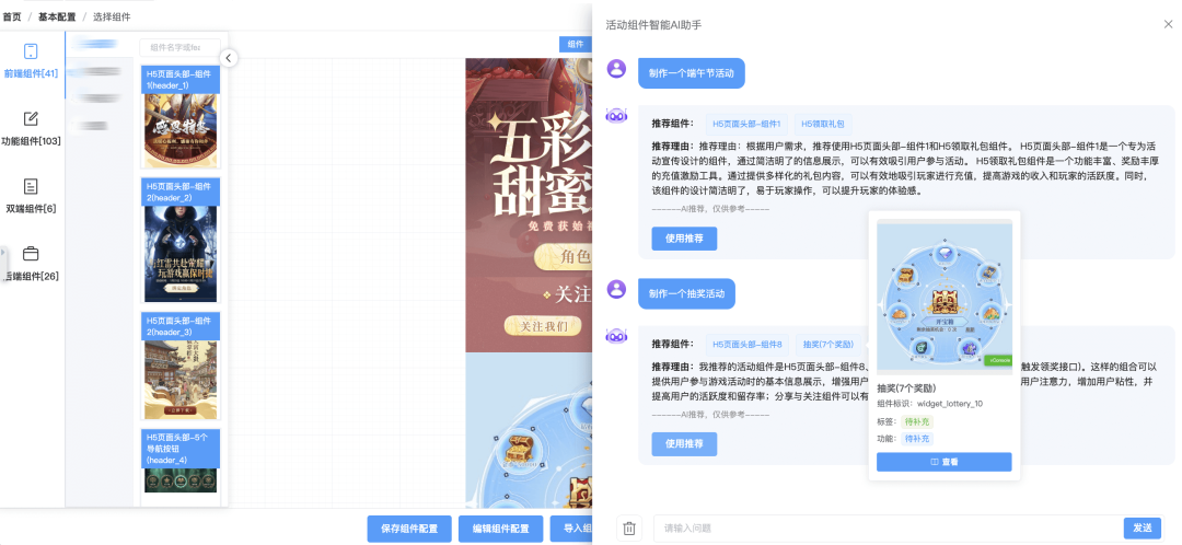 在组件画布的右侧新增了一个入口按钮,点击后在右侧弹出活动组件 AI 助手的交互界面。可以在这个对话框中使用自然语言给 AI 提出我们的活动需求,它将为我们推荐庞大组件库中最适合的组件,并给出了推荐理由。点击 “使用推荐” 即可以一键把 AI 推荐的组件装载到画布中,降低组件选择的成本。