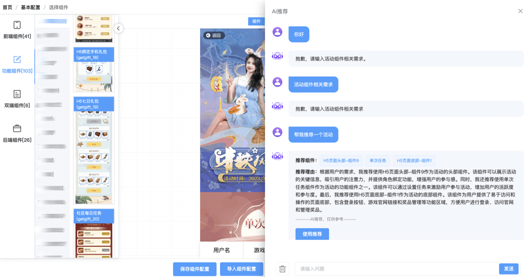 为了验证这个想法,就有了活动组件 AI 助手:目的是根据活动专员需求,推荐合适的活动组件,提供贴合需求的参考方案,降低组件选择成本。