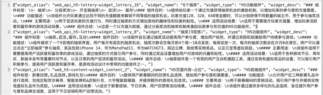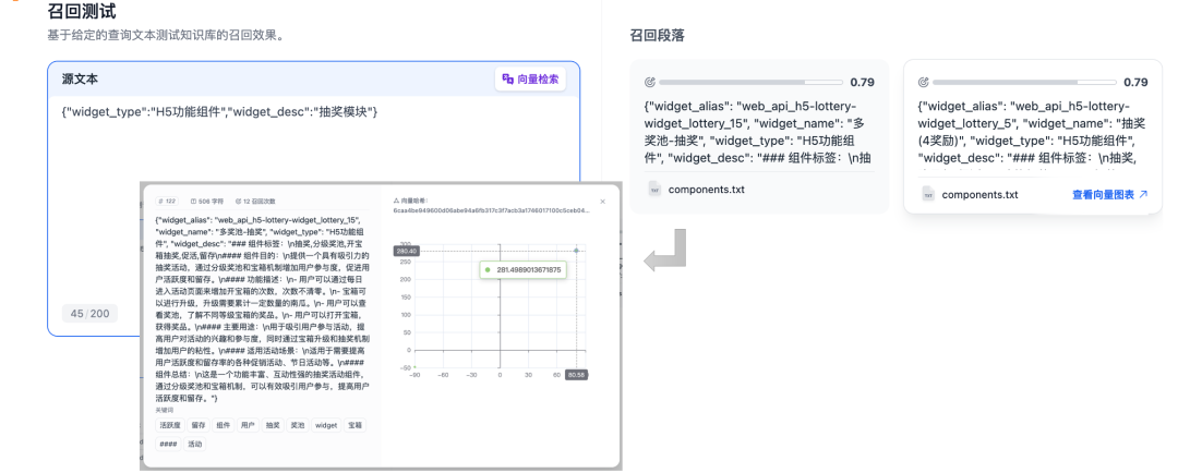 把活动专员的需求构造成与知识库相似的 json 格式,把组件类型放到 widget_type 中,需求描述放到 widget_desc 字段中,最终匹配出类型同为 "H5 功能组件" 且包含 “抽奖模块” 的知识段落: