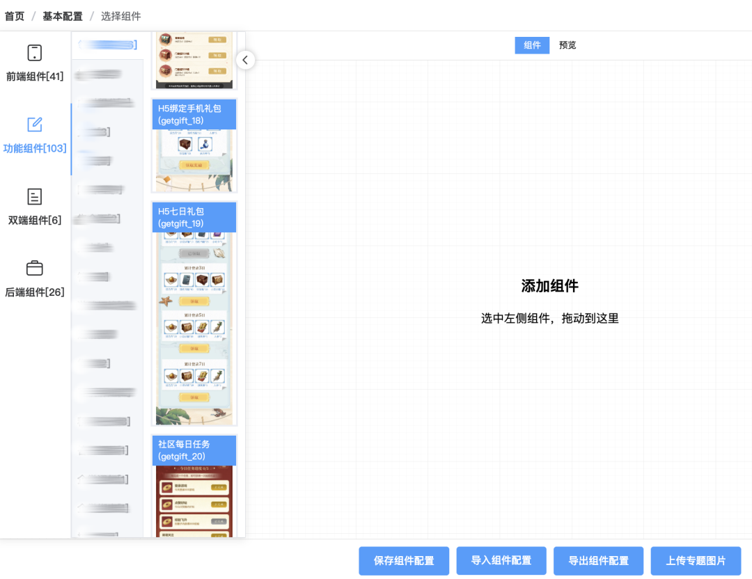 从左侧的组件库中拖取合适组件到右侧画布,组合出符合需求的组件活动。每一个组件是一个具备完整前后端功能的业务组件(也有纯前端元素的前端组件和纯后端功能的后端组件),而非开发人员使用的代码” 组件”。