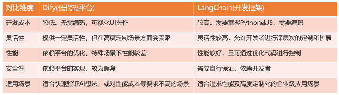 最后,对比了 Dify 等低代码平台和 LangChain 等开发框架的特点和适用场景,指出它们在企业级 AI 应用中的优劣和适用性。