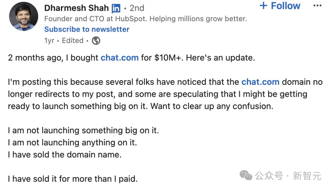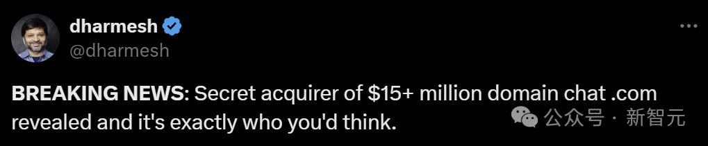 也就不难看出,OpenAI购买chat.com的意图所在。今天,Dharmesh发文表示,价值1500万美元以上的域名chat.com神秘买家身份揭晓,就是你想的那个!对于一直关注我的朋友们来说,你们可能还记得我在今年早些时候宣布以「8位数」的价格(后来报道为1550万美元)收购了域名chat.com。我当时也提到,我已经将这个域名卖给了一位未披露身份的买家。那会儿我不便透露买家是谁(我想着让他们在准备好的时候自己公布)。