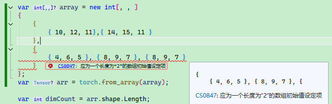 另外要注意,C# 有多维数组和交错数组,下面是交错数组的声明方式,TorchSharp 并不支持。多维数组是数组,交错数组是数组的数组,或数组的数组的数组,要注意区分。