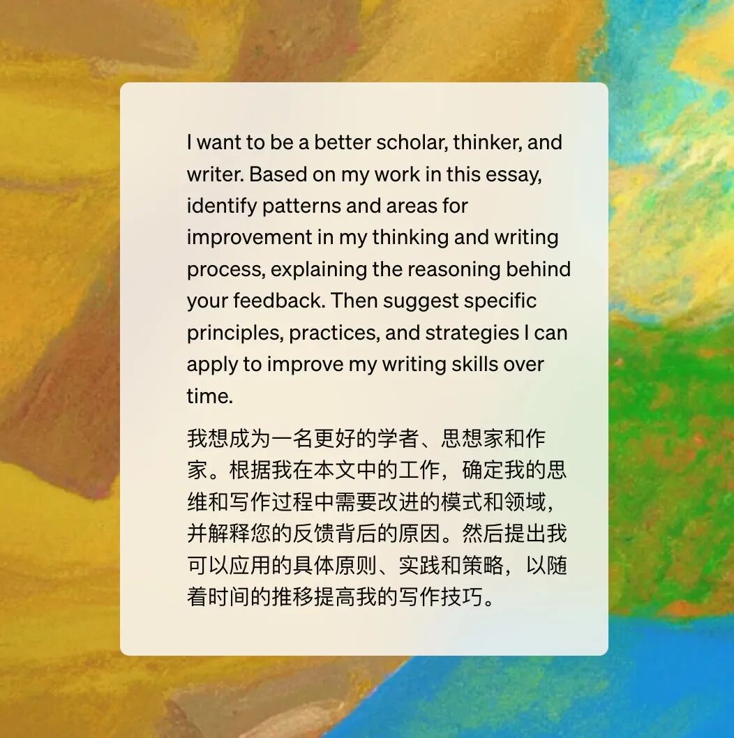写作不仅是为了交作业,它是提升批判性思维和写作技巧的一个过程。通过和 ChatGPT 互动,学生可以识别自己思维的盲点,并学会如何改进自己的论证。ChatGPT 可以帮助学生发现他们在写作中的常见问题,并提供策略,帮助他们在写作过程中持续进步。
