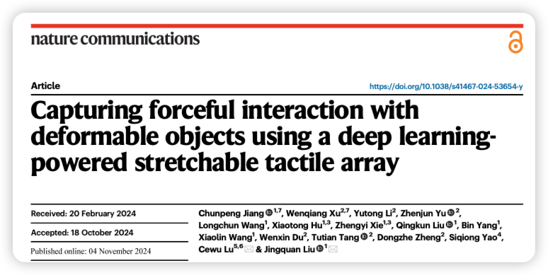 论文名称:Capturing forceful interaction with deformable objects using a deep learning-powered stretchable tactile array