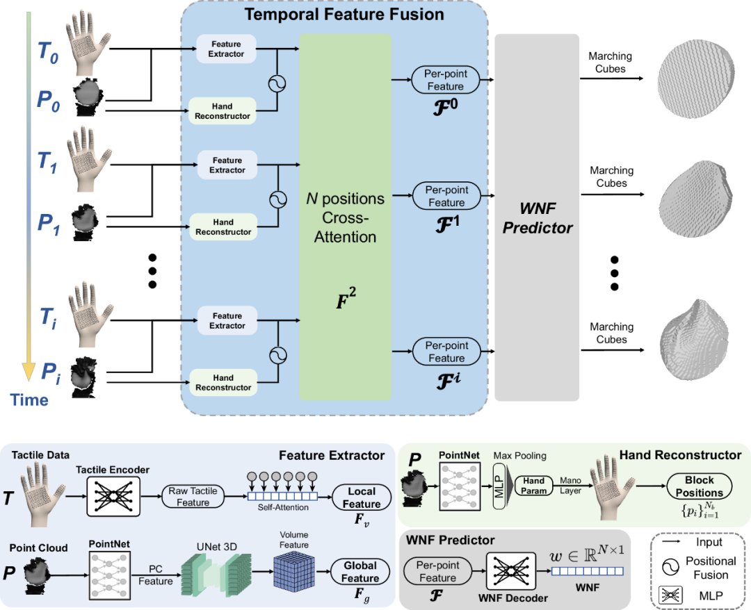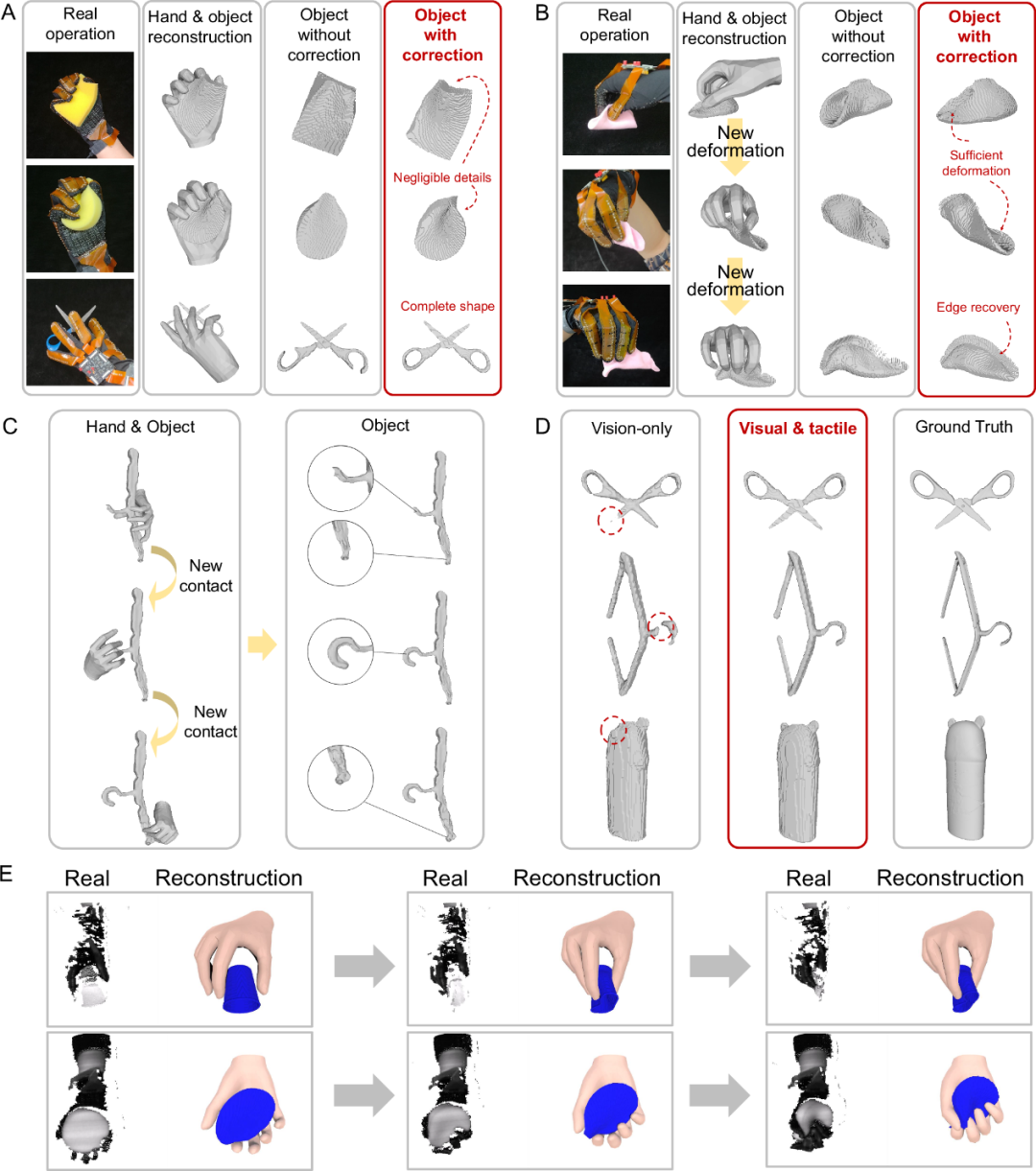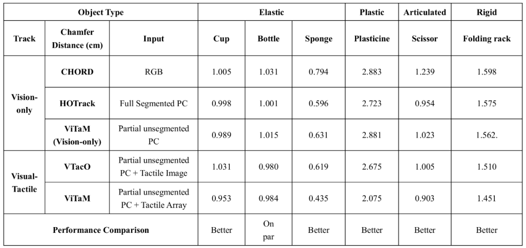 在人形机器人操作领域,有一个极具价值的问题:鉴于操作数据在人形操作技能学习中的重要性,如何有效地从现实世界中获取操作数据的完整状态? 如果可以,那考虑到人类庞大规模的人口和进行复杂操作的简单直观性与可扩展性,人形机器人再也不用担心没有高质量的操作数据资源了。 穹彻智能携手上海交通大学卢策吾和刘景全团队意识到,分布式触觉技术对于重建完整人类操作至关重要,当操作被遮挡时,触觉可以作为视觉的有效补充,从而一同还原出操作区域的形变状态、接触力位点和大小。因此,该团队提出了一种全新的视觉 - 触觉联合记录和追踪系统 ViTaM(为 Visual-Tactile recording and tracking system for Manipulation 的缩写),包括一个可伸缩的触觉手套,与一个基于视觉 - 触觉的联合学习框架。文章在 24 个物体样本中进行实验,涵盖了 6 个类别,包含刚性物体和可形变物体,重建误差均值仅为 1.8 厘米。 ViTaM 系统在未来发展中,有望被深度集成至机器人的电子皮肤之中,从而赋予机器人与周围环境进行无缝互动的能力。这不仅能够使机器人实时感知并精准响应多样化的环境刺激,更将极大提升其在复杂场景下的灵巧操作水平,推动智能机器人技术迈向更加先进和实用的新阶段。