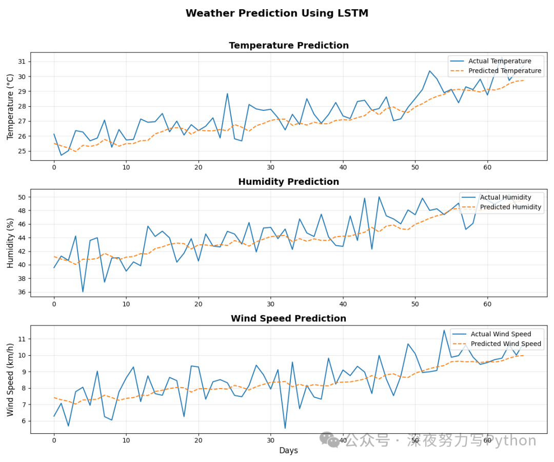 温度预测的图形展示了LSTM模型对温度时间序列的捕捉能力。如果预测线能够紧密跟随实际温度曲线,说明模型能较好地捕捉温度的变化趋势。如果偏差较大,则需要调整模型复杂度或序列长度。