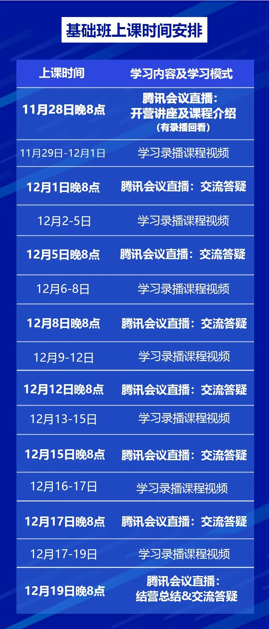 答:课程视频是录播的,课程视频有效期为4年,在有效期内可以无限次反复观看。开营讲座是腾讯会议直播模式,并提供回看视频。答疑是腾讯会议直播模式,答疑直播没有回看。