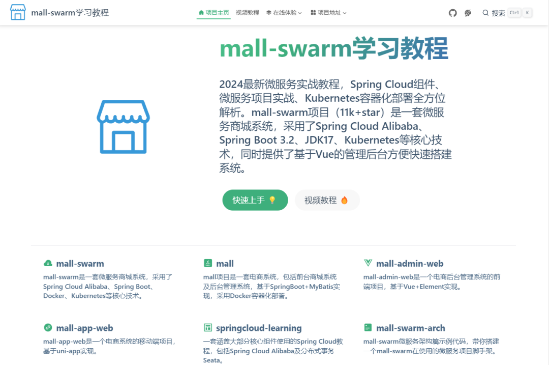 整套 视频教程 的内容还是非常完善的,涵盖Spring Cloud核心组件、微服务项目实战、Kubernetes容器化部署等内容,你也可以点击链接 mall-swarm视频教程 了解更多内容。