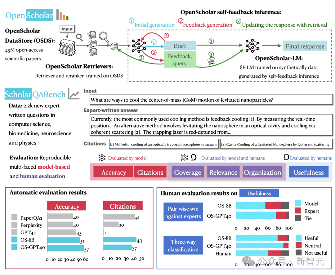 OpenScholar的提出就是旨在解决上述问题。模型在推理时会检索相关段落,并使用迭代式自反馈的生成方法来优化输出;搭配的专门基准ScholarQABench旨在对开放式科学问答进行现实且可重复的评估。
