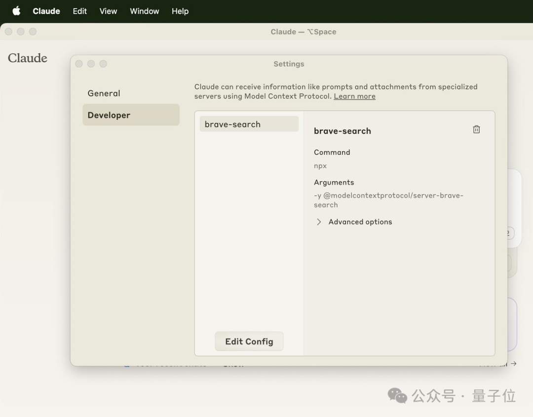并且,Claude桌面版APP更新后也内置了MCP服务器支持,只需要修改配置文件、重启即可生效。