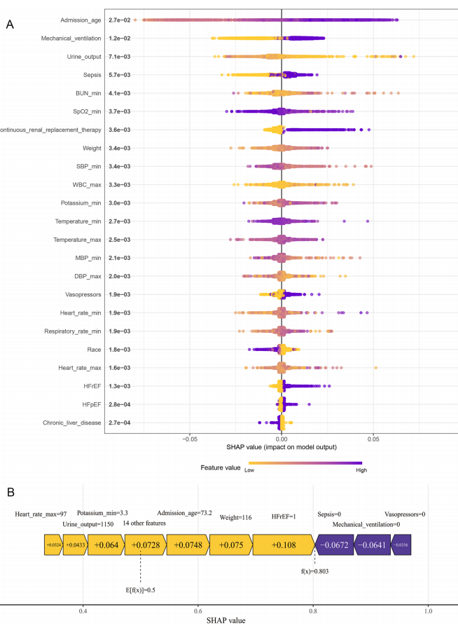 最后通过SHAP方法分析XGBoost模型的特征贡献,以SHAP力图和群体图形式可视化模型的可解释性。结果表明,关键预测因素包括年龄、机械通气、尿量、脓毒症、BUN、SpO2、CRRT和体重。综上所述,研究团队使用8种ML算法通过筛选ICU入院前24小时内的23个临床变量来构建预测模型。结果表明,XGBoost算法表现出强大的性能,具有鉴别力和校准能力,并在临床实践中显示出巨大的净效益。外部验证队列的结果进一步证实了模型的稳定性和准确性。为了更深入地了解模型,还用SHAP方法进行可视化,得出关键预测指标。同样是构建临床预测模型,别人都在用机器学习分析了,你还在常规套路挣扎?如果你也对机器学习课程感兴趣,不妨来看看郑老师推出的基于R语言的机器学习构建临床预测模型课程!面对面线上授课,实时交流,不怕零基础!