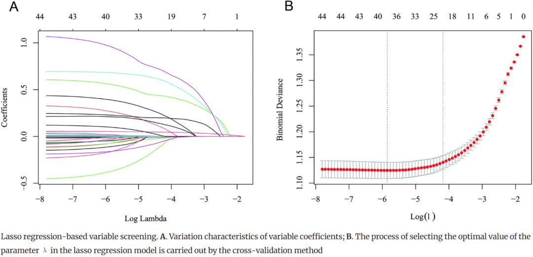 (A)变系数的变化特征;(B) 用交叉验证对Lasso回归模型中参数λ最优值进行选择