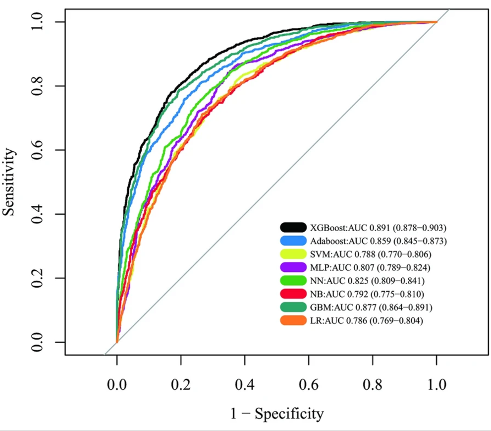 使用8种机器学习(ML)法构建预测模型(包括极限梯度提升(XGBoost)、支持向量机(SVM)、自适应提升(Adaboost)、多层感知器(MLP)、神经网络(NN)、朴素贝叶斯(NB)、逻辑回归(LR)和梯度提升机(GBM))。使用多种指标评估模型性能,包括ROC曲线、AUC值、敏感性、特异性、F1分数、准确性等,并绘制校准曲线和决策曲线(DCA)分析模型的临床适用性。研究结果表明,XGBoost表现最好,在验证中达到0.891(0.873-0.888)的AUC,在外部验证中达到0.769(0.756-0.782)。