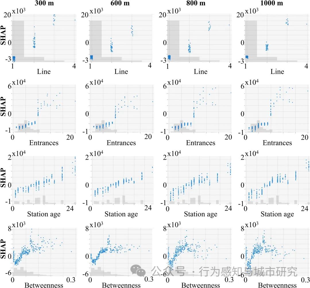 图7给出了台站特征变量的SHAP图。与建成环境变量相反,这些图表明缓冲区大小并不显著影响与地铁客流的相关性。