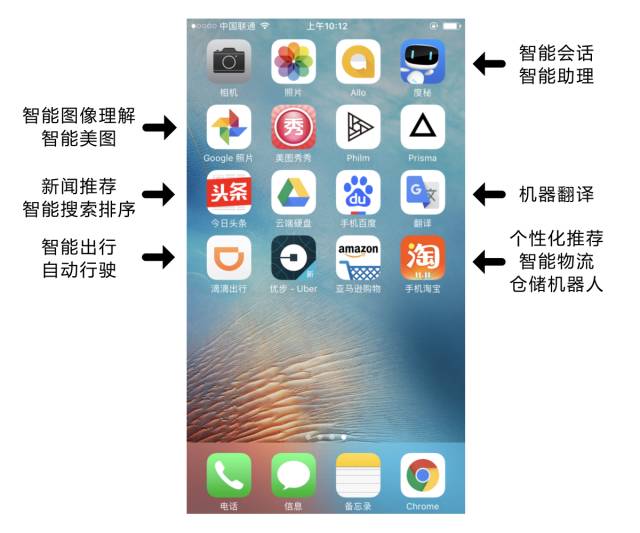 下图是一部典型的iPhone手机上安装的一些常见应用程序,可能很多人都猜不到,人工智能技术已经是手机上很多应用程序的核心驱动力。