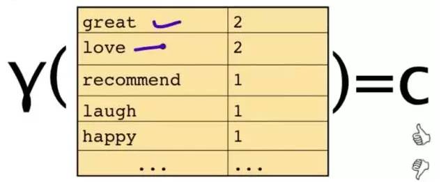 问题变成,这一类中这句话出现的概率是多少,当然,别忘了公式里的另外两个概率。例子:单词“love”在positive的情况下出现的概率是 0.1,在negative的情况下出现的概率是0.001。
