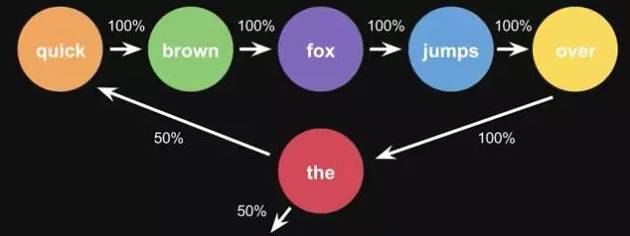 Markov Chains由state(状态)和transitions(转移)组成。例子,根据这一句话 ‘the quick brown fox jumps over the lazy dog’,要得到markov chains。