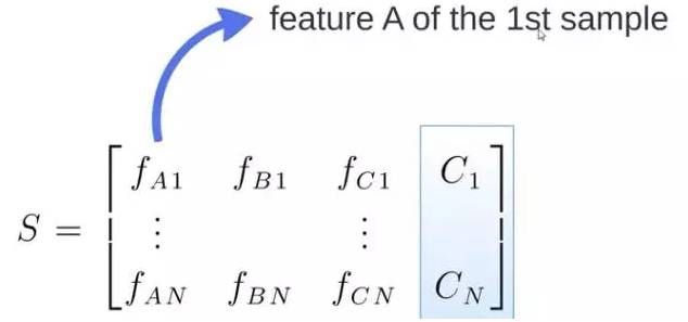 S矩阵是源数据,有1-N条数据,A、B、C 是feature,最后一列C是类别: