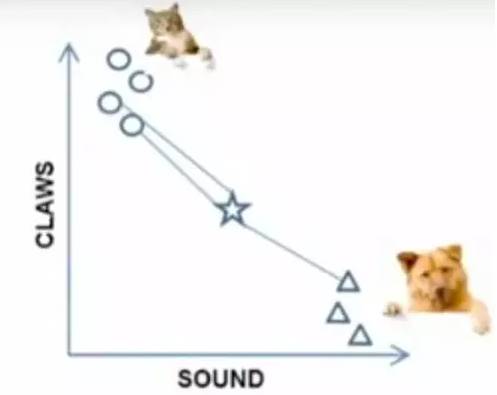 例子:要区分“猫”和“狗”,通过“claws”和“sound”两个feature来判断的话,圆形和三角形是已知分类的了,那么这个“star”代表的是哪一类呢?