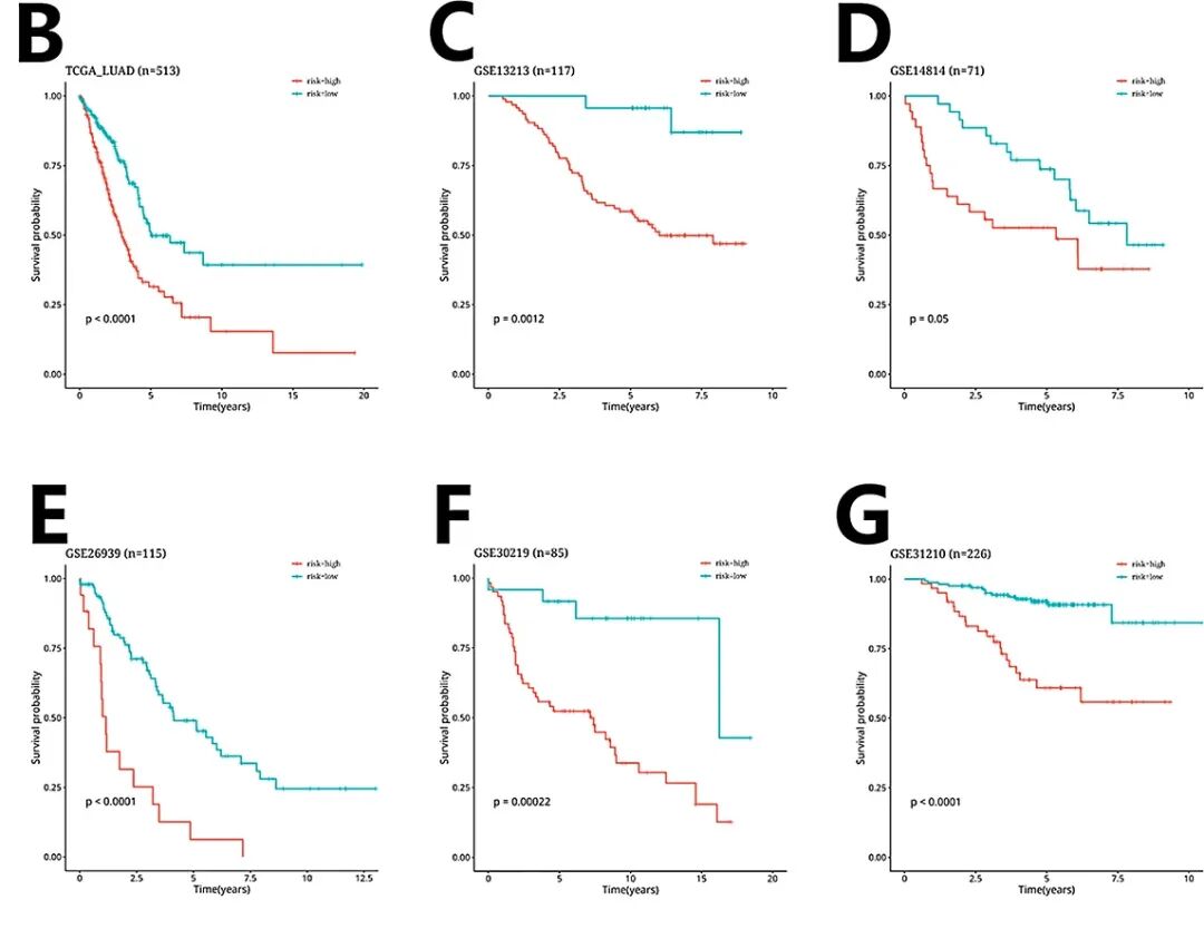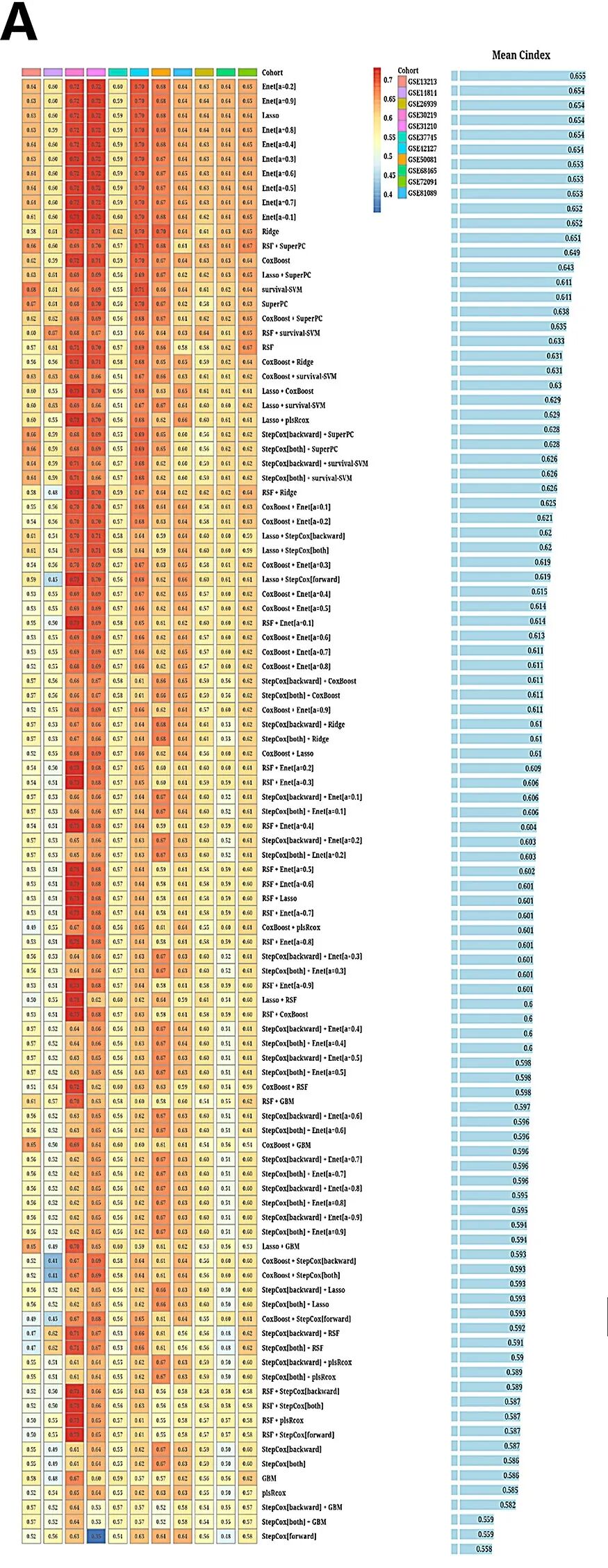 本研究对2030个线粒体相关基因进行了单因素Cox回归分析,鉴定出220个具有显著预后价值的基因。在TCGA-LUAD数据集中,使用LOOCV框架拟合了101个预测模型,计算了每个模型在11个验证数据集中的c指数,最优模型Enet[a = 0.2]具有最高的平均c指数(0.655)(图3A)。利用最优模型,根据预后基因的表达水平计算每位患者的风险评分,将样本分为高风险组和低风险组。在TCGA-LUAD数据集和其余11个验证数据集中,高危组患者的总生存率明显低于低危组(图3B-M)。本研究在合并所有样本的荟萃队列中观察到类似的趋势(图3N)。