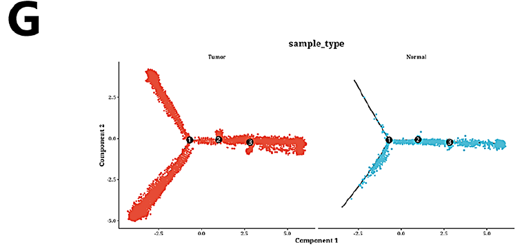 本研究分离上皮细胞进行独立降维和聚类分析。tSNE图显示了24个上皮细胞簇及其样本来源(图2A-B)。本研究发现簇7、8和12主要由正常上皮细胞组成,而其余簇则富含肿瘤细胞(图2C)。本研究计算每个集群的差异表达基因(DEGs),并将其用作标记(图2D)。在热图中,聚类16、21、20、10、18和22聚在一起,统一为S2;聚类1、13和23被归为S3;其余的集群被指定为S1,从而产生三个子组(图2E)。亚组轨迹图显示S1包含大部分上皮细胞,S2主要由肿瘤细胞组成,S3具有相对较高比例的正常细胞(图2F)。肿瘤和正常样本之间的比较显示,肿瘤衍生的轨迹包含更多的上皮细胞,分布在所有六种状态(图2G)。此外,本研究选择了100个在拟时间内表现出表达变化的基因(图2H)。转录因子分析发现S1中RXRB、TCF7L1、RARB、ZNF197和SP4富集;S2中FOXJ2、CTCF、KLF3、NFKB2、TCF7L2富集;S3中的NFIC、SNAI1、HNF4G、HFYA、ZEB2富集(图2I)。