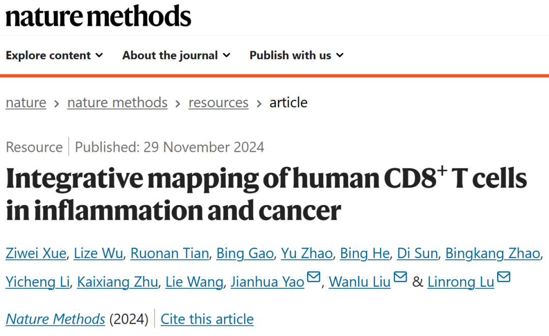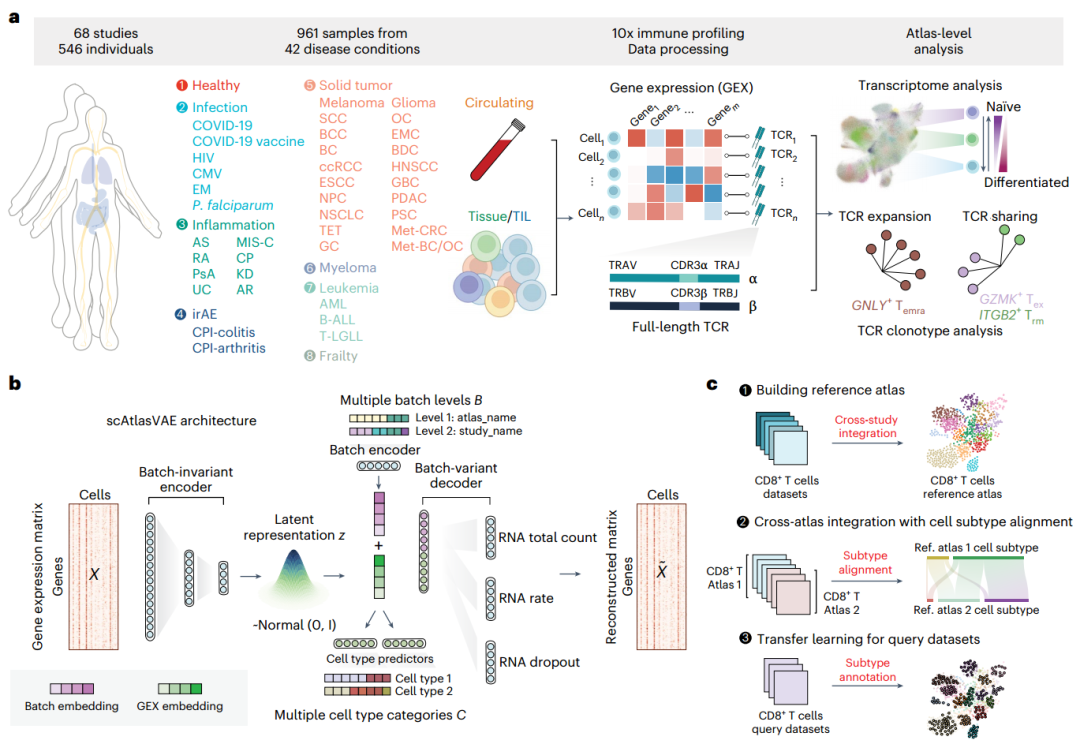 2024年11月29日,浙江大学鲁林荣、刘琬璐、腾讯AI实验室Yao Jianhua共同通讯在Nature Methods(IF=36)在线发表题为“Integrative mapping of human CD8+ T cells in inflammation and cancer”的研究论文。该研究介绍了scAtlasVAE,这是一个基于深度学习的模型,用于整合大规模单细胞RNA测序数据和跨图谱比较。