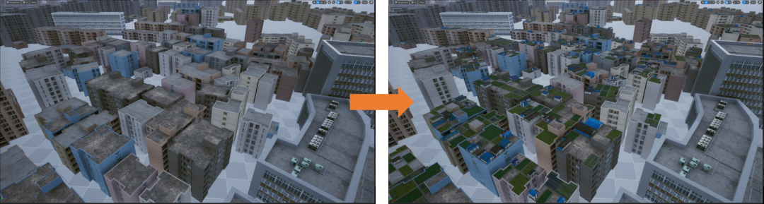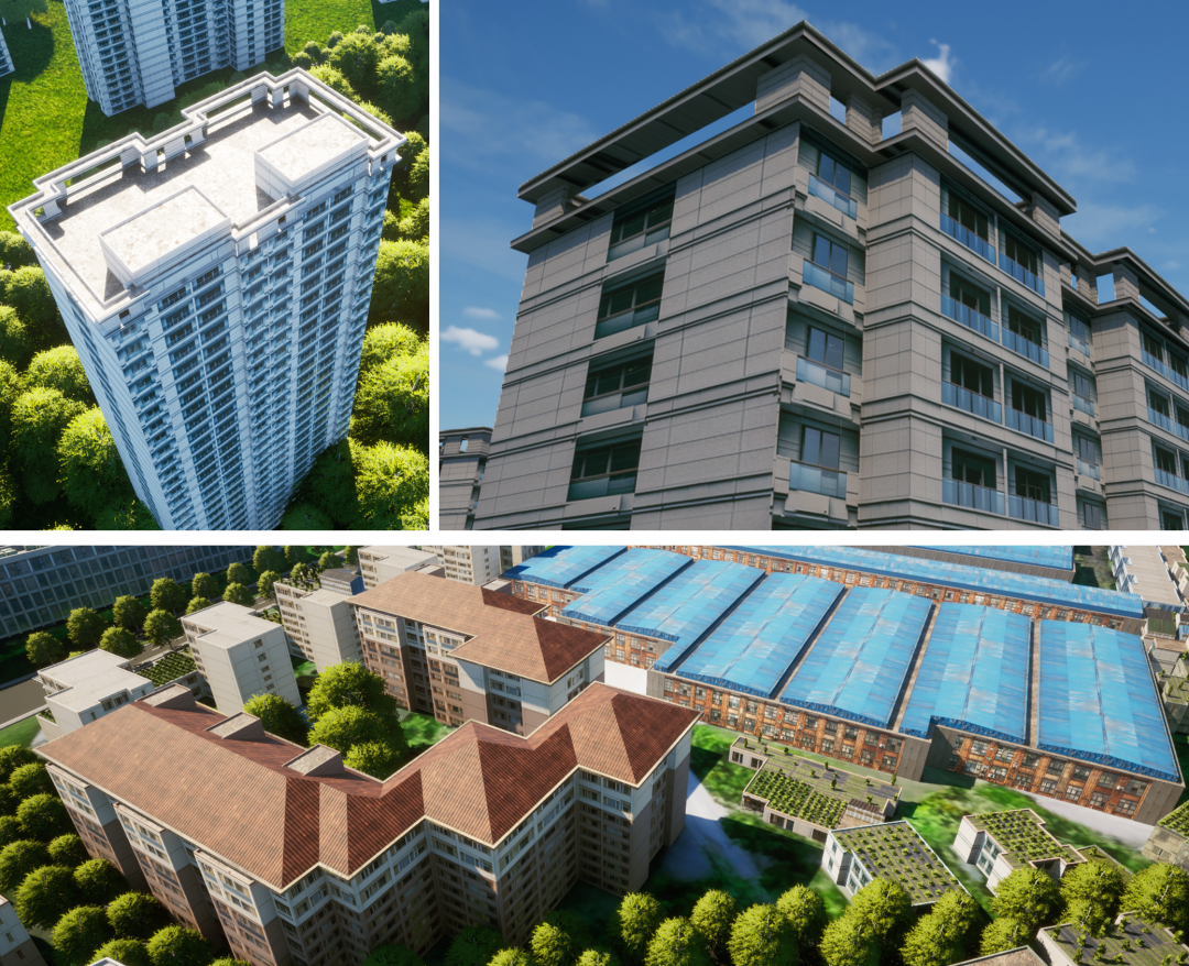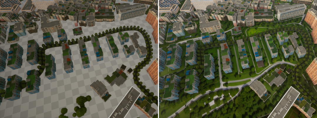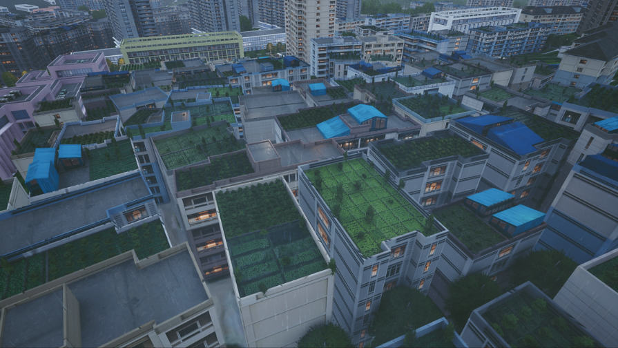 作为主要用于中观、宏观尺度进行智慧应用的三维城市场景,鸟瞰视角也非常重要,为此我们也探索了一些屋顶平面布局的逻辑模型,来丰富建筑屋顶。比如基于分割算法,对一些老旧片区的屋顶进行正交为主的区域划分,布局出棚屋、花池、菜园等等。最终得到这样的具有中国特色与烟火气的旧城风貌。这也很符合我们的一些特点,农耕文明为主,看到屋顶有种菜的就知道是中国城市。