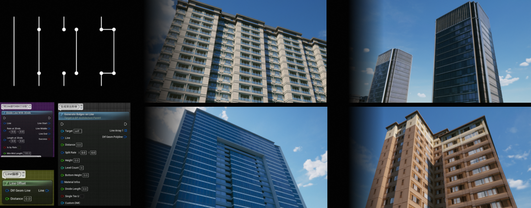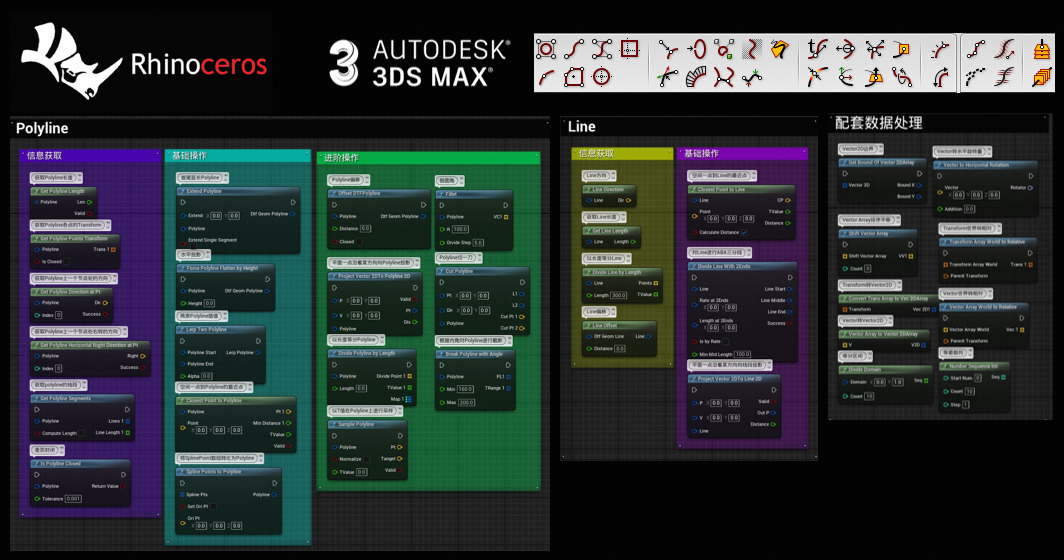 第二层是三维设计层,类似DCC软件的基础能力,它是以蓝图函数库为载体,提供点线面的通用几何处理与逻辑判断。为此,我也引入了一些UE之外的线条操作的几何概念,以支撑建筑设计学科的一些典型思路。功能诸如:线条最近点求取,平面投影、范围细分等等。