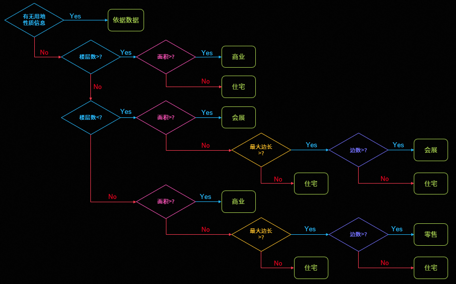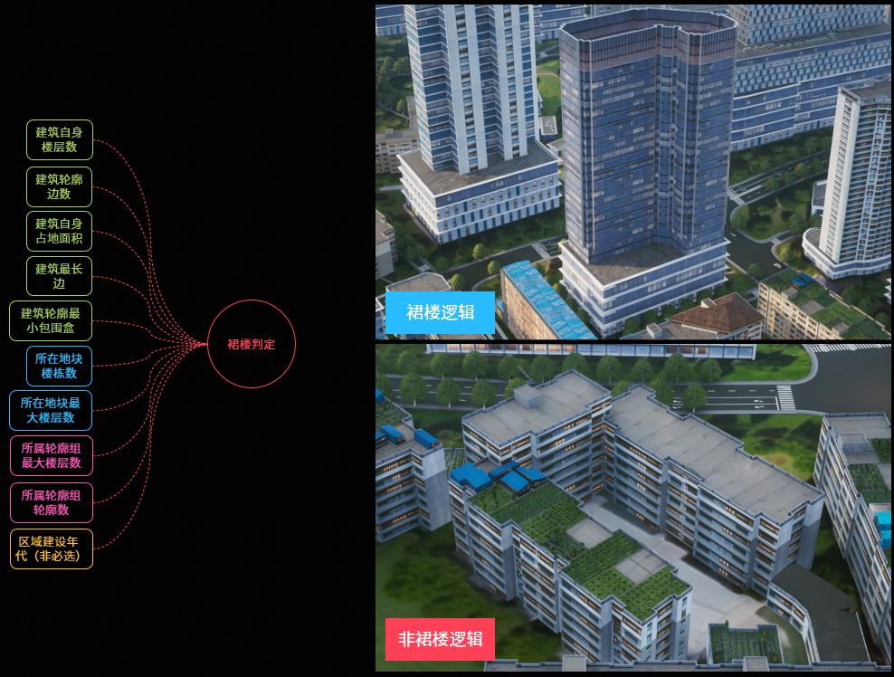 首先我们发现数据里有不少建筑的用地性质信息是缺失的,程序选择了错误的逻辑模型进行生成。(有的办公楼生成成了住宅,有的住宅成了办公楼。)这是因为开源地块数据没有覆盖所有建筑轮廓,所以我们基于建筑学与建筑规范中的一些常识与经验,依据我们的建筑属性集信息,对未知用地性质的建筑进行大致的归类,把它们分到最有可能的一种用地性质类型当中。裙楼策略